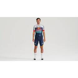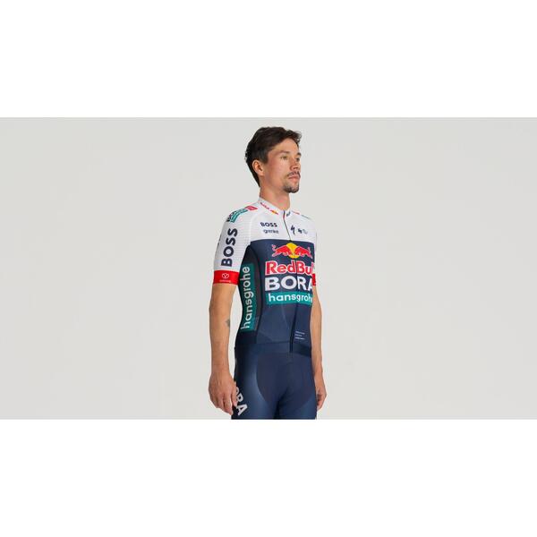 Muestra tu apoyo al equipo Red Bull - BORA - hansgrohe con el maillot de manga corta réplica, que presenta los gráficos oficiales del equipo y un diseño inspirado en los profesionales. El tejido elástico de punto plano en la parte frontal y la malla transpirable en la espalda y las mangas te mantienen fresco y cómodo, mientras que la protección UPF 30+ protege tu piel. Los puños y el dobladillo elásticos aseguran un ajuste firme, y los tres bolsillos traseros junto con la cremallera de largo completo aportan practicidad. El ajuste ceñido ofrece comodidad sin restricciones, ideal para cualquier ciclista.